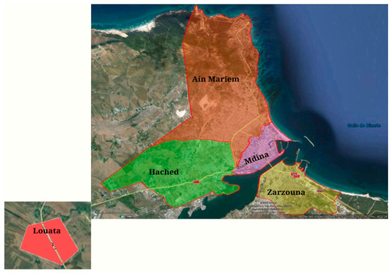 The municipality of Bizerte comprises five districts, including Medina, Aïn Mariem, Zarzouna, Hached, and Louata, as illustrated in Figure 1. It is located in the northern coastal region of Tunisia, bordered by the Mediterranean Sea. The municipality enjoys a strategic geographical position.