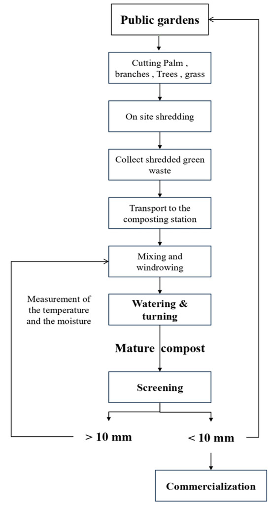 The municipality of Bizerte is responsible for the collection of GW from gardens and public spaces. The agents of the municipality collect this waste and crush it on-site. They then transport the crushed waste to the composting plant of the municipality of Bizerte, where it will be mixed and placed in windrows. To fix the humidity of these windrows, water will be added, and then temperature and humidity follow-up will be performed. During the composting process, the windrows are turned to ensure that aerobic fermentation takes place. After 24 weeks, the mature compost is gathered and screened. Finally, a sample will be taken and sent to the laboratory to be tested to ensure that it adheres to the standards. Figure 5 summarizes the working steps.