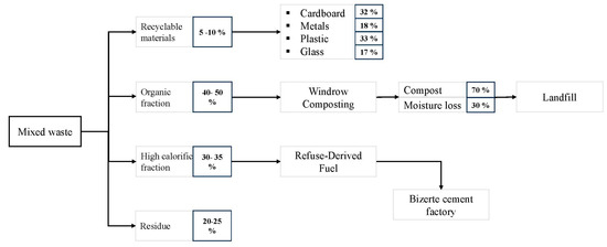 The amount of municipal waste generated in Bizerte in 2022 was 50,524 tons according to the municipality of Bizerte. In Bizerte, the absence of selective waste sorting complicates the application of recovery solutions, but in the long term, mechanical biological treatment (MBT) would appear to be an effective solution in line with the conditions pertaining to the Bizerte municipality. MBT facilities have become increasingly prevalent in the handling of municipal solid waste (MSW) as well as separately collected waste materials. The mechanical component of MBT plants is designed to efficiently recover materials such as plastics, glass, metals, and high-calorific alternative fuel, commonly known as Refuse-Derived Fuel (RDF). Meanwhile, the biological aspect of an MBT facility serves to stabilize the organic fraction of municipal solid waste (OFMSW) that has been mechanically separated from MSW through sieving [18,19,20].