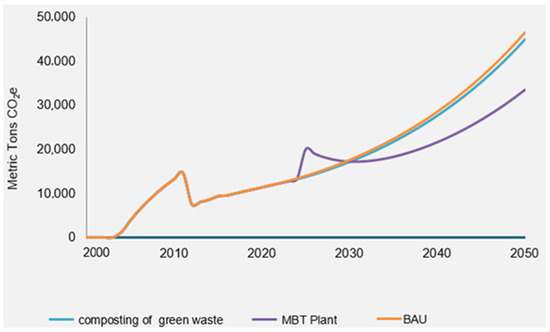According to Paul J et al. [64], composting can be utilized for municipal organic waste management to mitigate methane emissions resulting from the disposal of new organic waste in landfills. The first scenario with regard to green waste composting reveals a slight decrease in greenhouse gas emissions by 2050 compared to the BAU scenario, amounting to only a 3% reduction to 44,978 metric tons of CO2 equivalent. However, according to the second scenario, the implementation of the MBT plant significantly reduces greenhouse gas emissions by an impressive 28%. This reduction is so substantial that, by 2050, it is anticipated that emissions will amount to only 33,610 metric tons of CO2 equivalent. These results are depicted in the curve shown in Figure 10 for “Total emissions by scenario including CO2, BC, CH4, organic carbon”.