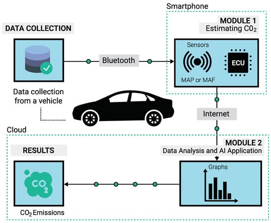 - Module 2—Data Analysis and AI Application: After estimating the CO emissions in Module 1, this cloud-based module utilizes data analysis and AI algorithms to examine the emissions patterns in relation to the type of employed fuel in the analyzed vehicle.