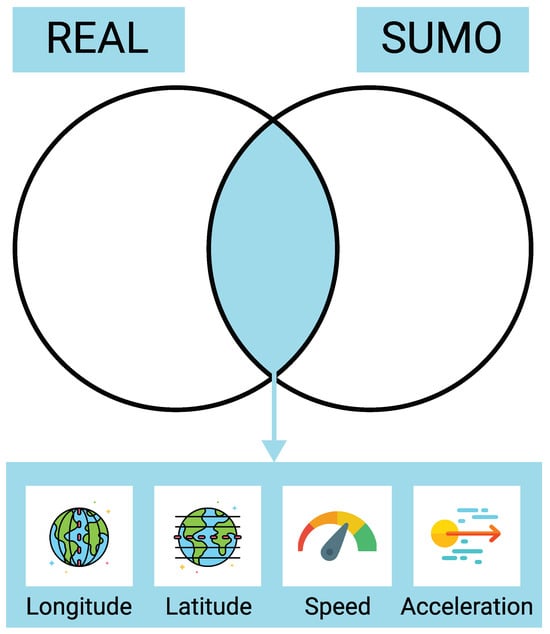 In order to allow computations of CO gas emissions in the simulations, it was necessary to use the two vehicular sensors, MAF and AFR (Equation (1)), but they are not available in SUMO. Therefore, the training of machine learning models using variables available in both environments—the real and the simulated one—was defined. It is noteworthy that the training data for the models came from the case study highlighted in Section 4. Thus, an intersection of the variables existing in both scenarios was applied, creating a hybrid dataset that can be used to train AI models, as can be seen in Figure 2.