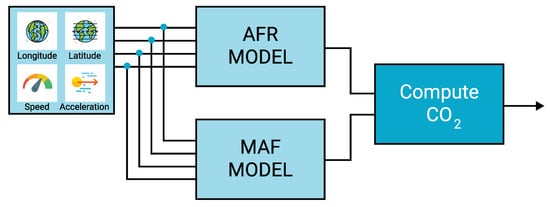 - Module 1—Estimating CO: This module is responsible for calculating continuous CO emissions based on sensor variables, notably the manifold absolute pressure (MAP) and the mass airflow (MAF). It is important to note that specific vehicle models may have different available sensors: while some vehicles are equipped with only an MAP sensor, some have only an MAF sensor, and some models have both. To handle these variations, when a vehicle lacks an MAF sensor, the estimation of CO emissions is carried out using an MAP sensor to estimate the MAF [19].