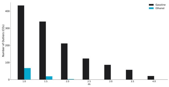 After applying the proposed approach to calculating CO emissions, the TEDA algorithm was used to analyze the instantaneous values related to the amount of gas produced by the vehicle. In this context, the presence of outliers in each fuel type was investigated. It is important to highlight the influence of the parameter m in Chebyshev’s inequality for anomaly detection. Therefore, understanding the relationship between the parameter m and anomaly detection is crucial for interpreting the results.