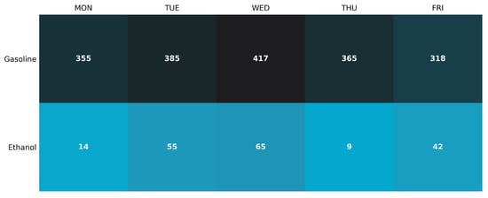 The simulated scenario was executed for both gasoline and ethanol fuels, with multiple runs to capture variations. The goal was to ensure that the simulated data reflected the diversity observed in the real-world scenario, allowing valuable comparisons. In this way, a total of 112,964 records relating to gasoline consumption and 40,291 records relating to ethanol consumption were collected from the real scenario. The predominance of gasoline use data indicates a greater representation of this fuel in the sample. To build a model, the collected data were separated, with 80% intended for training and 20% for testing, providing an adequate division to evaluate the effectiveness of the model in both situations.