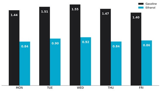 For the data collection procedure, a route of approximately 13 km was selected in the city of Natal, Brazil. The route encompassed urban areas with paved and asphalted sections and was conducted from 6:00 to 7:00 in the morning. The route was executed under two scenarios: one with the vehicle running on gasoline and another with ethanol. Each type of fuel was tested on five different days of the week (from Monday to Friday), resulting in a total of ten trips (five for each fuel type). Finally, after completion, all the stored data could be transmitted and processed to generate graphs using geolocation metadata.