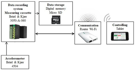 For the measurement of the frequencies and vibration amplitudes during road transport, a system was used whose diagram is shown in Figure 1.