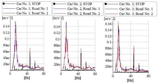 In this paper, for the spectral analysis of the vibration acceleration, amplitude spectra were used, representing the changes in the amplitudes of the vibration signals as a function of frequency. Figure 2 presents the amplitude spectra of the vibration recorded during the transport of the fruits.