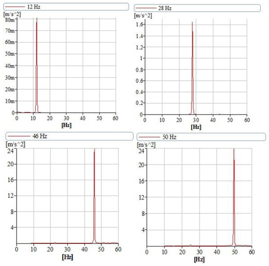 The spectra present the relation between the vibration frequency and the acceleration amplitudes. The vibration spectral analysis identifies four characteristic dominating frequencies: 12 Hz, 28 Hz, 46 Hz and 58 Hz.