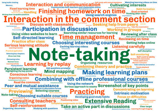 With “effective learning strategies” as the central theme, we systematically examined and identified meaningful units before conducting group discussions. Through this process, we obtained 135 open codes with 814 reference points. Spearman’s correlation analysis was performed to examine the relationship between the number of data sources and the reference points for the 135 open codes. The correlation coefficient was r = 0.901, indicating a highly significant positive correlation (p < 0.001) between the two variables. Therefore, this study employed the count of reference points for the code as a proxy for citation frequency. The top ten open codes with the highest number of reference points were as follows: taking notes (80), interaction in the comment section (54), completion of exercises (33), timely assignment submission (28), effective time management (27), study plan development (25), active participation in discussions (23), utilization of supplementary reading materials (23), integration of online learning with offline professional courses (19), and reviewing recorded class sessions for further understanding (18). The distribution of the open code is visually represented through a word cloud (Figure 1).