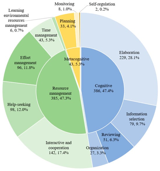 Based on the 32 axial codes and in conjunction with relevant research on learning strategy classification methods [,,], 12 selective codes were extracted to identify the core categories in terms of effective MOOC learning strategies for college students. The three core categories identified were cognitive, resource management, and metacognitive strategies. Table 1 and Figure 2 illustrate the distribution and structure of the codes. Cognitive strategies encompassed elaboration (229), information selection (79), reviewing (51), and organizing (27). Resource management strategies encompassed interaction and cooperation (142), help-seeking (98), effort management (96), time management (43), and learning environmental management (6). Metacognitive strategies encompassed planning (33), monitoring (8), and self-regulation (2). Finally, the coding process and code naming were thoroughly scrutinized to ensure precise alignment between the concepts and source material.