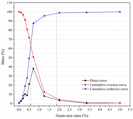 The input and output weights of sieves (M) were measured during the sieve analysis (described in Section 2.3). The acquired results are presented in Table 1. A diagram of the grain-size distribution for the initial Pb–Zn slag sample is provided in Figure 4.