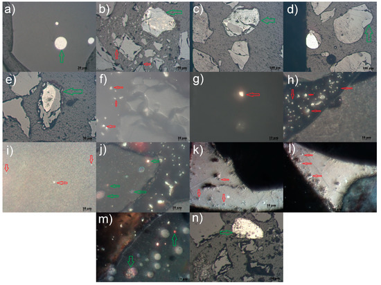 The details visible in the microphotographs of the slag samples are as follows: (a) spherical lead inclusions in a glassy matrix recorded in air and reflected light (marked with green arrow); (b) complex intergrowths of Pb and Zn phases with sphalerite, galena (marked with green arrow) and dark gray inclusions of cerussite (marked with red arrows), both recorded in air and reflected light; (c) complex intergrowths of Pb and Zn phases with sphalerite, galena, and wurtzite recorded in air and reflected light (marked with green arrow); (d) a simple fusion of a intergrowths of various lead phases with a vitreous matrix recorded in air and reflected light (marked with green arrow); (e) a simple fusion of sphalerite and amorphous matter recorded in air and reflected light (marked with green arrow); (f) inclusions of elemental silver (shiny white dots) in the glassy matrix recorded in oil and reflected light (marked with red arrows); (g) an inclusion of elemental copper in the glassy matrix recorded in oil and reflected light (marked with red arrow); (h) inclusions of elemental silver (shiny white dots) in the glassy matrix recorded in oil and reflected light (marked with red arrows); (i) an inclusion of elemental silver (shiny white dot) in the glassy matrix recorded in oil and reflected light (marked with red arrows); (j) inclusions of elemental copper (bright reddish-yellow dots in a glassy matrix recorded in oil and reflected light (marked with green arrows)); (k) oval inclusions of elemental silver (shiny white dots) in lead phase intergrowths recorded in oil and reflected light (marked with red arrows); (l) inclusions of elemental silver (brilliant white) in lead phase intergrowths recorded in oil and reflected light (marked with red arrows); (m) inclusions of elemental copper (bright orange) in a glassy matrix recorded in oil and reflected light (marked with green arrows); and (n) simple fusion of intergrowths of Pb and Zn phases recorded in air and reflected light (marked with green arrow).