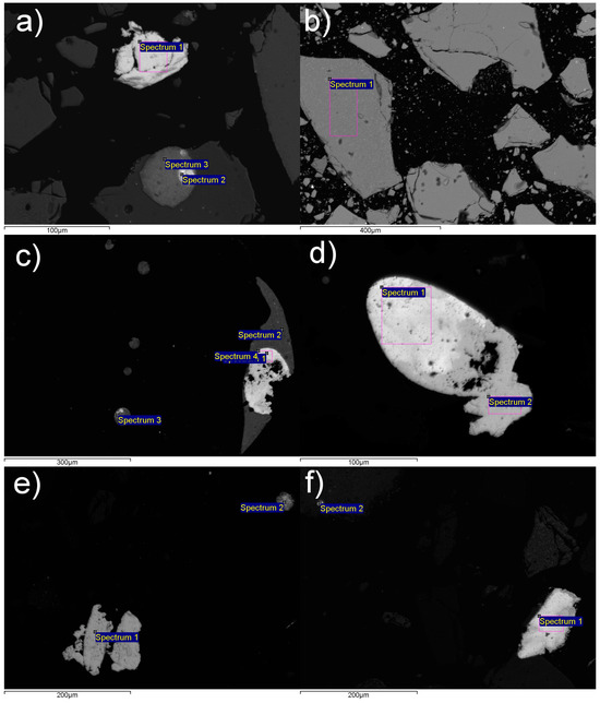Figure 7e illustrates two particles—one larger and more complex, the other significantly smaller. Both particles 7e-1 and 7e-2 comprise relatively high Zn content (33.10% and 38.41%, respectively), S content (36.97% and 32.21%, respectively), and certain quantities of Fe (8.94% and 6.57%, respectively). These particles might correspond to wurtzite or sphalerite (Zn-Fe-S combination), or zincite (ZnO). The presence of low calcium amounts refers to the possible occurrence of akermanite or monticellite in traces. The EDS quantification of spectra in Figure 7(f-1,f-2) shows the predominant presence of Pb, thereby indicating that the observed particles probably correspond to cerussite. Small quantities of elemental silver were detected in particles recorded in Figure 7e,f. Silver particles are usually oval-shaped, but elemental silver can also be found in the form of tiny wires with lengths of up to 5 µm. Aside from this, elemental silver and copper occur as small inclusions in the glassy matrix or complex mineral intergrowths, rarely exceeding 2–3 µm (silver) and 7–8 µm (copper). Additionally, elemental silver is frequently found in host grain cracks [8,52,53].