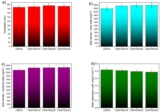 Physico-mechanical properties of mortar samples: (a) workability, (b) bulk density of fresh mortar, (c) bulk density of hardened mortar, and (d) water absorption coefficient.
