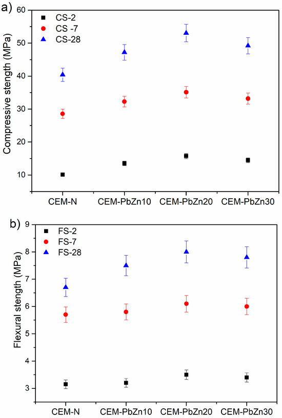 As shown in Figure 9a, differences in initial compressive strengths were more pronounced during the early stages of mortar hardening. After two days of hardening, the compressive strength of the CEM–PbZn10 sample was 25% higher than the CS-2 of the standard mortar sample (CEM–N). There was a 35.6% difference in CS-2 between CEM–PbZn20 and CEM–N, and a 30% difference between CEM–PbZn30 and CEM–N. For CEM–PbZn10, CEM–PbZn20, CEM–PnZn30, and CEM–N, the differences in the final 28-day strengths (CS-28) were 14.14%, 23.8%, and 17.9%, respectively. A higher increase in initial strengths can be explained by the pozzolanic effect of Pb–Zn slag filler [68]. The CEM–PbZn20 sample has the highest final compressive strength (CS-28 = 53.05 MPa), indicating that the Pb–Zn filler contributes the most in its quantity of 20%. Therefore, it can be seen that a slag–based filler content of over 20% has no beneficial effect on mechanical strengths.