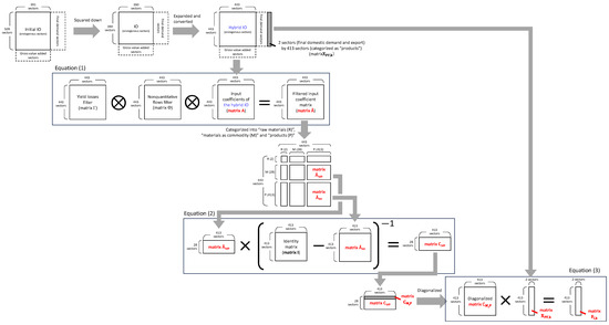 The model uses a hybrid IO table based on both flows of products in monetary units and physical units for analysis. The Ministry of Internal Affairs and Communications, Japan (MIC) provided an original IO table, which presents a 509 by 391 matrix of monetary units for 2015 [54]. The producer price evaluation table (basic classification) was selected from the input–output tables set for this study. The initial IO table is described as a competitive import type in which domestic production and import data are merged in an input. This is helpful for subdividing an import-specific sector from a merged domestic production and import sector.