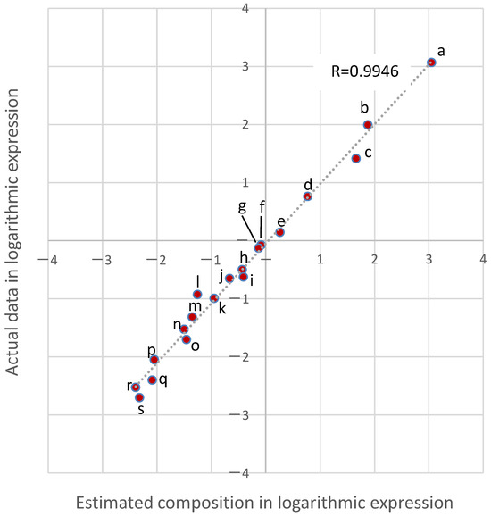 Correlation between the estimated composition and actual data. Note: The composition of each estimated element and actual data in intermediate goods (Table 3) and automobiles (Table 4) is shown here. In the figure, a: Fe in passenger motor cars; b: Al in passenger motor cars; c: Cu in passenger motor cars; d: Co in lithium-ion rechargeable batteries; e: Li in lithium-ion rechargeable batteries; f: Fe in LaCo magnets; g: Fe in NdFeB magnets; h: Ce in ternary catalysts; i: Nd in passenger motor cars; j: Nd in NdFeB magnets; k: La in LaCo magnets; l: Dy in passenger motor cars; m: Co in cemented carbide tools; n: Dy in NdFeB magnets; o: La in optical lenses; p: Co in LaCo magnets; q: Y in optical lenses; r: La in ternary catalysts; s: Y in ternary catalysts.