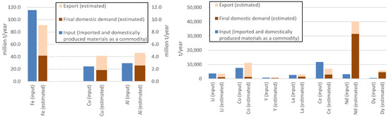 The estimated element composition and actual data strongly correlate positively (Figure 2). This result indicates that the actual data comprehensively supports the estimated element composition data despite the detailed difference between the estimated and actual data discussed above. The WIO-MFA model and other similar IO analysis models estimate only primary base metals (iron, copper, aluminum, lead and zinc) and additive elements of special steels (manganese, chromium, nickel, molybdenum, niobium, vanadium, tungsten, cobalt, platinum and neodymium) [45,47,51,52,53,73,74,75,76,77,78,79,80,81]. Battery materials and multiple rare earth elements have never been analyzed in an input–output approach. This study initially reveals the element composition, such as lithium, yttrium, lanthanum, cerium and dysprosium, using the input–output approach. The generated element composition data show the stock and flow of selected elements used for final goods as well as intermediate products. The quantitative volume of minor metals in intermediate products was also not estimated, excluding the bottom-up approach for dysprosium [82,83]. The newly estimated composition of some critical minerals contributes to analyzing the circular flow of critical minerals.