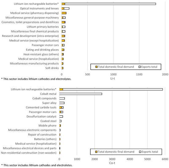 Regarding battery materials, lithium and cobalt are used for lithium-ion rechargeable batteries, which include lithium cathodes and electrolytes, and are predominantly exported to foreign markets (Figure 4). This indicates that domestic recycling minimally impacts securing secondary lithium and cobalt for battery manufacturers in Japan. Considering the lifetime and accumulated volume of lithium-ion rechargeable batteries in the present and future, the primary provision of battery materials is strongly required for the time being. In addition to this viewpoint, the technological trend of cathodes requires consideration in estimating the future stock of recyclable battery materials. Lithium-ion rechargeable battery cathode types vary with the energy and discharge capacities. Lithium-ion rechargeable batteries in the portable electronics market have mainly adopted lithium cobalt oxide (LCO) as a cathode due to its superb energy content per unit volume [72]. Lithium-ion batteries’ energy capacity and ignition danger vary with cathode types [84]. Lithium-ion rechargeable batteries currently use other cathodes, such as lithium nickel–manganese–cobalt oxide (NMC), lithium nickel–cobalt–aluminum oxide (NCA), lithium manganese oxide (LMO) and lithium ferro-phosphate (LFP). The cathode type is generally decided based on the required energy capacity, the cost of raw materials, safety and environmental burdens. Based on the estimated volume of domestically accumulated battery materials and technological trends, policymakers need to consider the possible impacts of policy implementation to promote recycling end-of-life lithium-ion rechargeable batteries. Furthermore, policymakers are required to create intergovernmental cooperation for a global circular flow of lithium-ion batteries since most batteries are exported to foreign countries. In the context of a comprehensive mineral resources policy, the advanced forecast of technical trends of cathode types and the geographically estimated distribution of battery materials are required for policymakers. Nansai et al. (2014) and Nakajima et al. (2018) estimated global distribution for some critical minerals, such as iron, copper, nickel, cobalt, neodymium and platinum, with the WIO-MFA model, but not for lithium [75,77]. For the creation of an international circular flow of critical minerals, the quantitative estimation of overseas destinations is required.