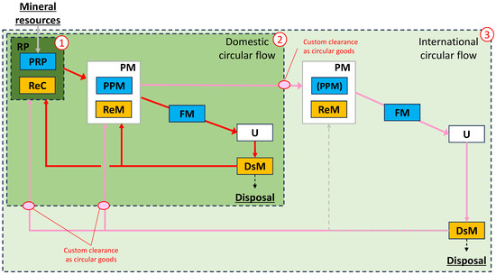 Figure 6 shows the similarity structure relationship between domestic and international circular flows from a comprehensive mineral resources policy viewpoint. Additional legal systems and policy support are required to create a domestic circular flow of critical minerals in the final products that are dominantly demanded in a country (Scope 2 shown in Figure 6). Based on the hierarchy of circular economy strategies [22], discarded final products in good condition are recommended to be reused, repaired, refurbished, remanufactured or repurposed rather than recycled. Some export-dominant final products and parts need to be part of international circular flows (Scope 3 shown in Figure 6). A new custom clearance system facilitates the adequate circulation of parts and scraps, which are uniquely identified as “circular goods” with international traceability systems.