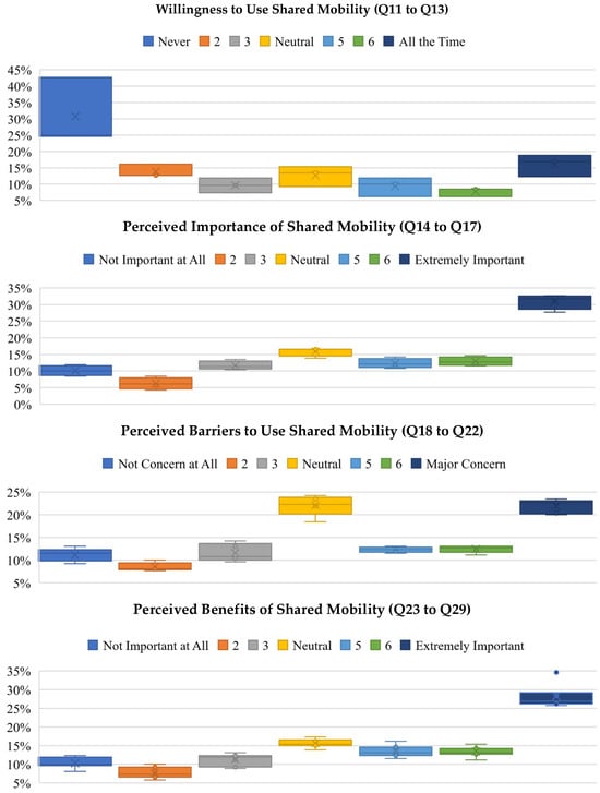 Figure 1 represents the respondents’ engagement with shared mobility services and their prospective perception of embracing these services. A boxplot was selected to represent the four aspects that were designed to measure the public acceptability of shared mobility in Amman. Each box expresses a single level of the provided 7-point Likert scale, in which the percentage of received replies per category was combined for each aspect. The aspect of willingness to use shared mobility was measured using three questions (Q11 to Q13). Notably, the dominant response was “Never”, signifying a pronounced reluctance among a substantial proportion of respondents, with an average of 30.8%. However, the relatively large variation in the “Never” selection for the three questions shows that it might not significantly represent the participants’ willingness to use shared mobility.