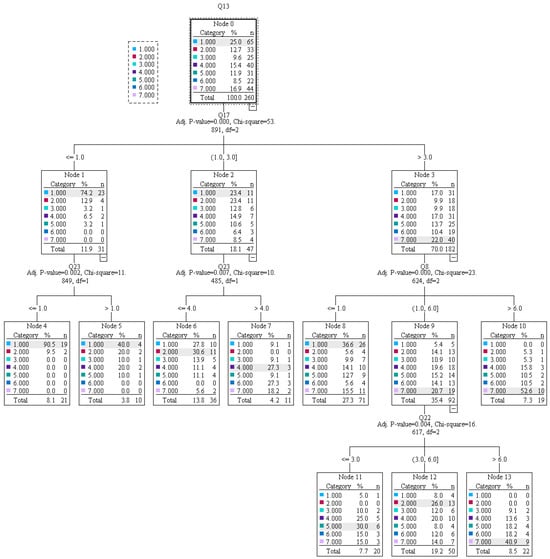 The usage of ride-sharing services for a daily commute, represented by Q13, was selected as the dependent variable for the developed classification tree. The usage of ride-sharing services has been selected as the dependent variable for this study due to several reasons. Firstly, it reflects the current trends in urban mobility, as it represents a shift from traditional transportation modes to more collaborative and technology-driven solutions. Secondly, ride-sharing services provide a direct measure of the adoption and acceptance of shared mobility concepts among residents, which helps in evaluating shared mobility potential. Thirdly, by choosing ride-sharing service usage as the dependent variable, we can explore and understand the behavioral factors influencing residents’ decisions to opt for shared mobility. Finally, the findings from analyzing ride-sharing service usage can inform strategies to promote sustainable mobility solutions in Amman, as it has practical implications for urban planning and policymaking.