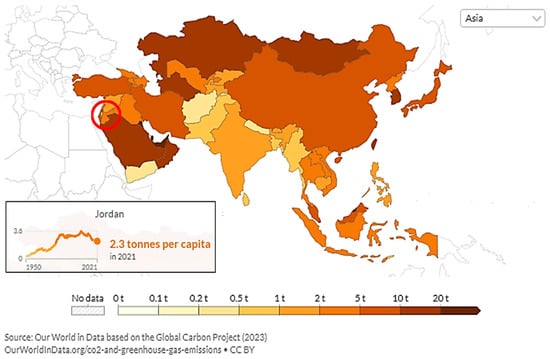 Recently, Jordan’s carbon footprint has become a significant concern. As shown in Figure 3, in 2021, Jordan’s per capita CO2 emissions were 2.35 tons, which raises environmental and sustainability concerns, representing an average annual growth rate of 5.20 percent [] (. As shown in Figure 3, when compared to other Asian countries, this emission rate per capita is notably high. This elevated level of CO2 emissions per capita indicates a pressing need for policies and strategies that promote sustainability and reduce carbon emissions. Consequently, this highlights the significance and potential impact of initiatives such as the promotion of shared mobility options in cities such as Amman.
