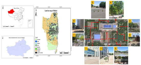 The study was conducted in Shihezi, Xinjiang (44°18′50″ N, 86°03′24″ E). Shihezi is located in the middle section of the Tianshan Mountains, in the southern part of the Junggar Basin. It has a typical temperate continental climate, with cold winters and hot summers. Based on meteorological statistics from 2012 to 2023, the highest temperatures typically occur in mid to late July, with an average maximum temperature of 38.2 °C. The historical highest temperature occurred on 21 July 2015, reaching 41 °C. The study area is the external environment of the library at Shihezi University, surrounded by abundant water bodies and vegetation. The southeastern side features Shuxiang Lake, the eastern side has a recreational area for students and faculty, and the north and south sides are lined with asphalt roads with large canopy trees planted on both sides, as shown in Figure 2.