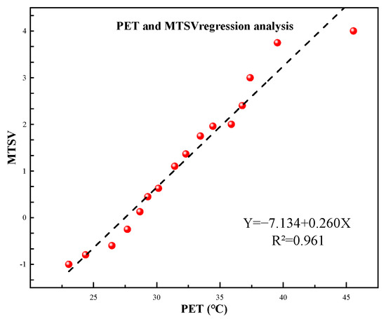 Based on the analysis above, the TSV varies among residents in different climatic regions, and the neutral temperature and thermal comfort range of PET also differ. In order to accurately evaluate comfort in Xinjiang, the PET evaluation range for the summer was adjusted. Meteorological data collected from monitoring stations were used to calculate the mean radiant temperature (Tmrt) using Equation (1). Tmrt, along with other meteorological parameters and basic human information, were input into the Rayman Pro software to calculate PET. Based on the method used by Lin et al. [42], the average thermal sensation vote (MTSV) corresponding to each 1 °C of PET was calculated, as shown in Figure 3.