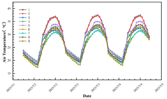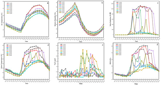 As shown in Figure 5a,b, Ta decreases and RH increases with time from 0:00 to 8:00 at all measurement points. Ta reaches its lowest point and RH reaches its peak at 8:00. After 8:00, Ta increases and RH decreases as G strengthens, reaching their peaks and lowest points at 18:00, respectively. At 18:00, points 1 and 2 have higher Ta (37.47 °C and 37.26 °C, respectively) and lower RH (17.40% and 17.71%, respectively). These two points have no buildings or vegetation obstructions, with SVF values of 0.871 and 0.796, and G values of 1047 W/m2 and 1045 W/m2, respectively. Due to the presence of water bodies around point 2, evaporation-induced heat absorption regulates the microclimate, resulting in lower Ta compared to point 1. After 18:00, as the sun trajectory changes, G gradually weakens, leading to a decrease in Ta and an increase in RH. Points 1 and 2 have no obstructions, allowing rapid heat dissipation and significant decreases in Ta compared to other points during the same period. Points 3, 6, 7, and 9 have lower Ta and higher RH throughout the entire period. Point 3 is shaded by trees, with an SVF of 0.375 and weak G, and is also influenced by the presence of water bodies. Point 6 is shaded by buildings except during 8:00–10:00 when it is exposed to strong G, and the higher reflectance of the underlying surface material causes lower Ta compared to other points during the same period. Point 7 is located on the west side of the building, shaded by both trees and buildings, with an SVF of 0.155, weak G, and an underlying surface of grass, which has a cooling and humidifying effect. Point 9 is partially shaded by vegetation, with an SVF of 0.510 and weak G, and the presence of a large water body and soil as the underlying surface enhances convective heat exchange, resulting in a more significant cooling and humidifying effect. Although point 8 is exposed to strong G, it is close to the water body and located in the dominant downwind direction, and is thus significantly influenced by the water body and has a better Ta and RH compared to points 1 and 2.