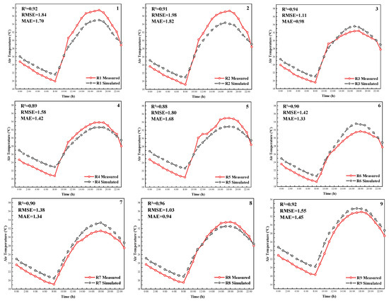 Rosso [45] and Salata [46] conducted multiple studies and found that the RMSE between ENVI-met simulated values and measured values ranged from 0.66 °C to 7.98 °C. The currently accepted RMSE values range from 0.52 °C to 4.30 °C, and MAE values range from 0.27 °C to 3.67 °C [47]. In this study, the RMSE errors between the measured and simulated values ranged from 1.03 °C to 1.98 °C, and the MAE errors ranged from 0.94 °C to 1.82 °C, which meet the requirements and indicate good simulation results.