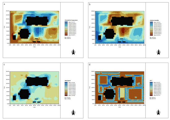 Output microclimate parameters of the optimal PET scheme. Note: The black part is the building, (a) is Ta, (b) is RH, (c) is Va, and (d) is PET.
