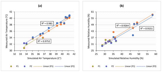 To facilitate this comparison, we opted for a linear trend line analysis. The obtained trend lines allowed us to quantitively assess the congruence between the simulated and measured data points based on the integral coefficient of determination (R2). The air temperature trends exhibited a high degree of agreement, with R2 values reaching 0.97 and 0.98 at measurement points P1 and P2, respectively. The relative humidity comparisons indicate relatively lower R2 values of 0.92 at P1 and 0.91 at P2. While slightly diminished in comparison to air temperature, these values still indicate a substantial level of agreement between the simulated and measured relative humidity. Wind speed, while demonstrating low R2 values of 0.80 and 0.91 at P1 and P2, respectively, maintained satisfactory concordance between measured and simulated values. Despite the lower R2, the consistency in trends suggests that the model effectively captures the essential features of wind variations. The obtained high R2 values signify a strong correlation between the simulated and measured microclimate variations, reinforcing the reliability of the model in capturing microclimate dynamics, air temperature, humidity and wind speed trends for downtown Annaba. These findings are in concordance with the established reliability of the ENVI-met microclimate model, as validated in numerous prior investigations in various contexts [46,62].