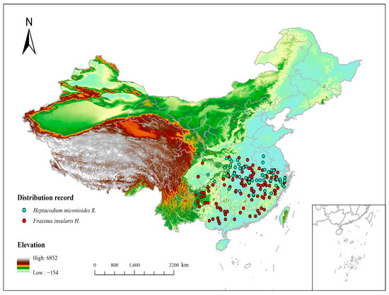 Figure 1. Locations from occurrence records of H. miconioides and F. insularis in China.