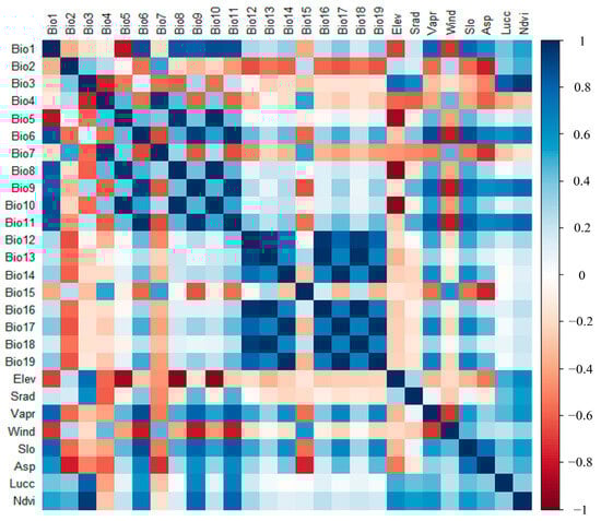Bioclimatic variables downloaded from the WorldClimate WorldClim 2.0 database (http://www.worldclim.org/ (accessed on 30 November 2023)) were used to model predicted species distributions [27]. These variables include current climate data (1990–2020) and future climate data (2041–2060) at a resolution of 2.5 min, which includes four emission models (Table 1). Slope and aspect data derived from elevation data (from the Geospatial Data Cloud https://www.gscloud.cn/ (accessed on 30 November 2023)) were then extracted using ArcGIS 10.5 software. Land-Use and Land-Cover Change (LUCC) were obtained from the Ministry of Natural Resources (http://wwww.ngcc.cn (accessed on 30 November 2023)) and Normalized Difference Vegetation Index (NDVI) data were downloaded from the Resource and Environmental Science Data Center of the Chinese Academy of Sciences (http://www.resdc.cn (accessed on 30 November 2023)). These environmental variables play an increasingly important role in predicting climate change and related research, and in supporting climate policy decisions. Bivariate correlation analyses were performed using SPSS on environmental variables grouped together. If two variables |r| ≥ 0.85 were considered to be significantly correlated [28], 1 variable with relatively low biological significance was excluded to reduce model overfitting (Figure 2), and finally, 12 bioclimatic factors, 3 terrain factors, and 5 other environmental factors were selected (Table 2).