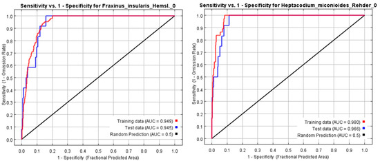 The two most important parameters in MaxEnt are feature combination (FC) and regularization multiplier (RM), the optimal selection of which helps to significantly improve the prediction accuracy of the model. Among them, FC has five selectable options, namely linear (linear, L), quadratic (quadratic, Q), product (product, P), threshold (threshold, T), and fragmentation (hinge, H), which can produce 31 different combinations; the RM parameter is generally set to less than 4, and 1 is used for every interval of 0.1 from 0.1 to 4 RM, with a total of 40 RM values used. The principle of this model is to use the actual geographic distribution points of species and environmental variables to construct a fitness zone model to project the ecological needs of species and simulate the potential distribution of species [29,30]. The obtained distribution point coordinates and environmental variables of H. miconioides and F. insularis were imported into the MaxEnt model; 75% of the randomly selected distribution points were used for model construction, and the remaining 25% of the distribution points were used for model validation and testing with 500 iterations, and the other parameters were set to the default values [31]. The area of the Receiver Operating Characteristic Curve (ROC) (AUC value) assesses the accuracy of the simulation results [32]. When the AUC value is 0.7 to 0.8 it indicates average model accuracy, 0.8 to 0.9 is good, and an AUC value higher than 0.9 indicates excellent model accuracy [33]. The AUC values for F. insularis and H. miconioides were greater than 0.9, 0.949, and 0.980 (Figure 3), respectively, indicating that the predictions of the MaxEnt model were accurate and highly predictable.