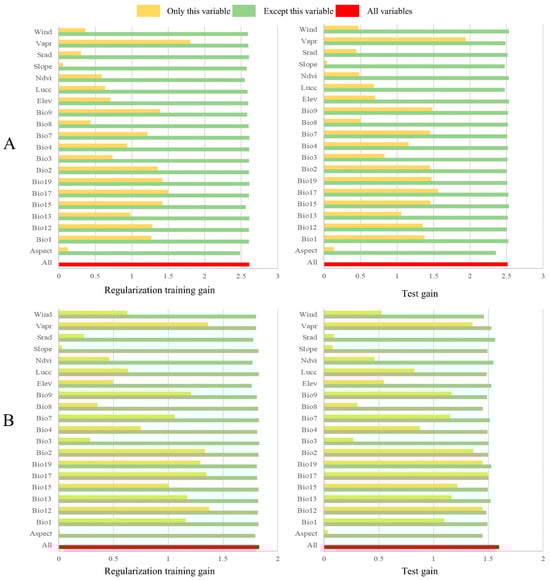 Figure 4. The jackknife test results for environmental factors affecting Heptacodium miconioides (A) and Fraxinus insularis (B) (ALL stands for all variables gain).
