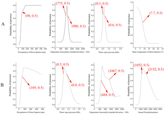The environmental factors with the deepest influence on the potential areas of distribution for the two plants in order of contribution were (Figure 4), for H. miconioides: Precipitation in Driest Quarter (52.8%), Temperature Seasonality (13.1%), Water vapor pressure (10.4%), Mean Temperature in Driest Quarter (3.5%); the cumulative contribution of the four environmental factors is 79.8% (Table 3). It can be seen that the above four environmental factors are the dominant environmental factors affecting the potential distribution area of H. miconioides. For F. insularis, the most influential factors were: Precipitation in Driest Quarter (49.8%), Water vapor pressure (23.9%), Temperature Seasonality (4.4%), Annual Precipitation (3.6%). The cumulative contribution of the four environmental factors amounted to 81.7%, with the precipitation factor having the greatest effect on F. insularis. In this paper, we set the threshold to 0.5 based on our previous research and the principles of the MaxEnt modeling [39], and when the probability of these variables is greater than 0.5, the corresponding environmental variables are suitable for growth. When the Precipitation in Driest Quarter (Bio17) is greater than 90 mm, Temperature Seasonality (Bio4) is in the range of 775~900, Water Vapor Pressure (Vapr) is in the range of 0.5~0.6 kpa, and the Mean Temperature in Driest Quarter (Bio17) is lower than 7.7 mm, the environment is conducive to the survival of H. miconioides. When the Precipitation in Driest Quarter (Bio17) is greater than 105 mm in the driest season, Water Vapor Pressure (Vapr) is 0.5–0.8 kPa, Temperature Seasonality (Bio4) ranges from 484 to 1067, and Annual Precipitation (Bio12) ranges from 1052 to 2152 mm, the environment favors the survival of F. insularis (Figure 5).