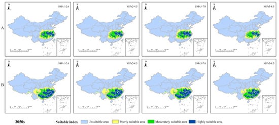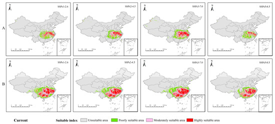 The present and future suitable areas are distributed in the subtropical climate zone within the range of 20°~40° N in China, and generally, the lower the latitude, the higher the temperature [47].