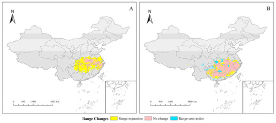 Figure 7. Potential Distribution of Heptacodium miconioides (A) and Fraxinus insularis (B) under future climates.