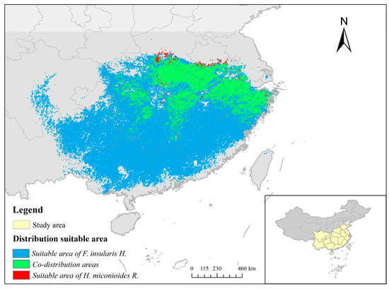 Ecological niche overlap is the phenomenon of two or more species with similar ecological niches sharing or competing for common resources when they live in the same space [41]. In most cases, however, only partial overlap between ecological niches occurs, one part of the resource is co-utilized, while other parts are occupied individually [42]. Based on the predicted results from the ecological niche model, the ecological niche overlap and geographic distribution overlap of H. miconioides and F. insularis, respectively, were calculated to better analyze the competitive relationship between them. The higher the degree of ecological niche overlap, the more resource utilization is contested between the two species, leading to increased competition. When the geographic distribution threshold is taken as 0.6, the center of the distribution of H. miconioides will migrate southward in the future, while the center of the distribution of F. insularis will remain unchanged, and the competitive relationship between the two will remain strong; in the current environment, the ecological niche overlap between the two is 0.7261 for D and 0.9188 for I. The larger the overlap value, the more serious the competition between the two for local resources. In the future environment, the D and I values were 0.8048 and 0.9551, and the ecological niche overlap increased further; for H. miconioides, F. insularis is also an important factor affecting its survival. In addition, the current and future geographic overlap between the two was average, 0.5351 and 0.6209, respectively (Table 6). In the study, the ecological niche overlap and geographic distribution overlap of the two species increased further in the 2050s, which would affect the survival of H. miconioides. The area of spatial overlap between the two is mainly concentrated in southeastern China, and spatially, it can also be seen that F. insularis covers the area which is habitable by H. miconioides (Figure 9). It has been suggested that a nature reserve could be established to separately demarcate a suitable growing area for H. miconioides.