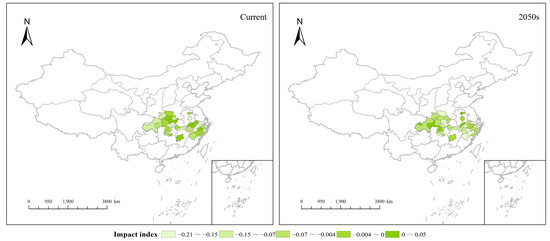 Environmental changes and human activities are continuously affecting the spatial patterns of plant species, and the study of their spatial characteristics and driving mechanisms can better protect the survival of endangered plants [43]. We used the GTWR model with the H. miconioides fitness zone index as the dependent variable and the F. insularis fitness zone index as the independent variable. Before running the GTWR model, all the variables need to be standardized to avoid the overfitting phenomenon; the R2 and the corrected R2 are higher than 0.932, which shows that the GTWR regression model can explain the effect of the independent variables on the dependent variable to a high degree. There was spatial differentiation in the influence of the fitness index of F. insularis on H. miconioides at different times (Figure 10). Specifically, the overall influence of the F. insularis biodiversity index on H. miconioides has increased, but the range of the negative high-value areas has changed, and the negative high-value areas which were distributed in the southern part of Shaanxi, the eastern part of Sichuan, and the northern part of Zhejiang in the current environment, moved to the southern part of Henan and the junction between Zhejiang and Anhui in the 2050s; additionally, there was no high-value area in the positive direction, and the low-value area gradually moved to the western part of China.