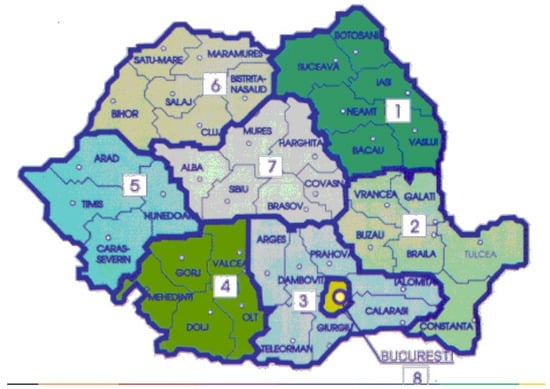 Romania’ NUTS 2 region and component counties. Legend: 1—North-East Region, 2—South-East Region, 3—South Muntenia Region, 4—South West Oltenia Region, 5—West Region, 6—North-West Region, 7—Center Region, 8—Bucharest–Ilfov Region. Source: [69].
