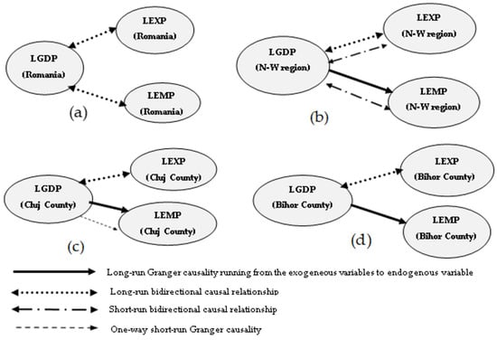The Granger causality relationship between economic growth (GDP), total expenditure on R&D (EXP) and individuals employed in the R&D sector (EMP) in Romania (a), in the NW Region (b), in Cluj County (c) and in Bihor County (d). Source: authors’ contribution.