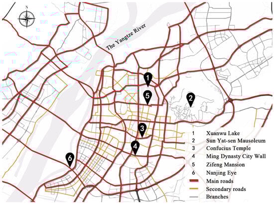 In this study, landmark landscapes in Nanjing are categorized into two types: historical–cultural and modern landscapes. Based on prior research, a total of 20 landmark landscapes in Nanjing have been identified by scholars. Among these, 13 are historical–cultural landmarks, which include eight famous buildings or structures: the Confucius Temple, the Ming Dynasty City Wall, the Jiming Temple, the Presidential Palace, the Rain Flower Terrace, the Yuejiang Tower, the Zhan Garden, and Drum Tower Park. Additionally, three are situated on mountains: the Sun Yat-sen Mausoleum, the Ming Xiaoling Mausoleum, and Purple Mountain. The remaining two, the Qinhuai River and Xuanwu Lake, are noted as traditional waterscapes. The study also encompasses seven modern landmarks, namely the Yangtze River Bridge, the Nanjing Eye, the Nanjing Youth Olympic Sports Park, the Nanjing International Youth Culture Center, the Zifeng Mansion, the Jinling Hotel, and the Nanjing Radio and TV Tower.
