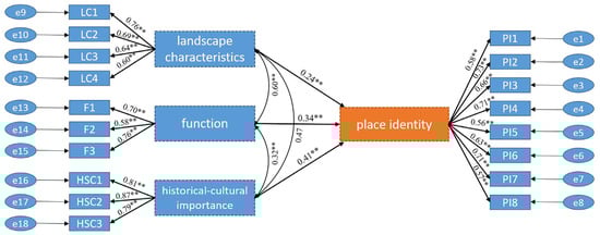 The analysis results suggest that the model demonstrated a good fit. For landscape characteristics (LC), LC1 showed a high explanatory degree at 0.76, while LC2, LC3, and LC4 had explanatory degrees of 0.69, 0.64, and 0.60, respectively. Within the function (F) category, F3 exhibited strong explanatory power with a path coefficient of 0.77, followed by F1 at 0.68 and F2 at 0.58. Regarding the historical–cultural importance (HCI) factors, HCI1-3 all indicated strong explanations with values of 0.81, 0.87, and 0.79, respectively. The place identity (PI) variables also showed high explanatory degrees, notably PI2 (0.76), PI4 (0.71), PI7 (0.68), PI3 (0.68), and PI8 (0.58), signifying their significance. Conversely, PI1, PI5, and PI6 had slightly lower path coefficients of 0.54, 0.53, and 0.53, respectively. Overall, these results suggest that the observed variables effectively reflected the latent variables, thus exerting direct influences on place identity.