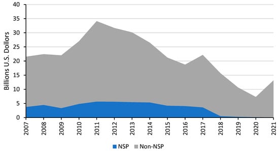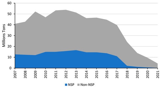 At the end of 2001, China’s accession to the WTO resulted in a significant increase in both the amount and quantity of waste imports []. The ensuing years witnessed a steady expansion in waste importation, culminating in an unprecedented zenith in 2011. Nevertheless, the promulgation of the Solid Waste Import Management Measures in the same year heralded a persistent decline in total waste imports for six years. Intriguingly, this diminution was predominantly attributed to commodities exempt from NSP regulations, as the import value of NSP-regulated products remained relatively stable. The advent of the NSP in 2017 signaled a dramatic contraction in China’s waste import volumes, persisting for four consecutive years. The NSP’s regulatory grip was so effective that by 2018, the importation of regulated waste products had dwindled to negligible levels, as illustrated in Figure 1.
