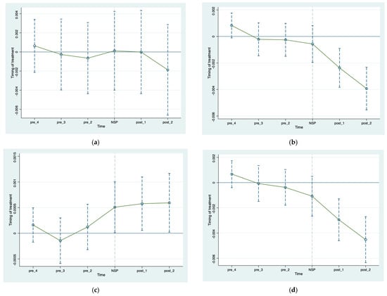 To satisfy the parallel trend assumption of the difference-in-differences methodology, following Sun [], we performed a parallel trend test. The results are plotted in Figure 4. For the estimations in pre-periods, zero is located within a 95% confidence interval, indicating that the variance between the control group and treatment group are insignificant before the NSP and the trends for these two groups are parallel before the regulation. The results fail to reject the parallel trends in the pre-period, suggesting that the DID methodology’s assumption is satisfied.