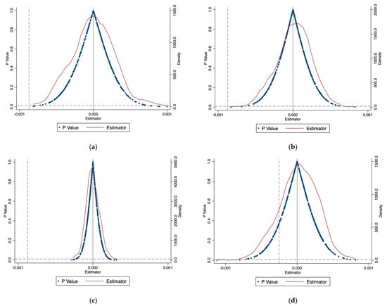 Acknowledging the possible unobservable factors in the pre-period, and following Chetty et al. [], this research conducts a counterfactual estimation using a placebo test as a robustness check. We randomly drew fake treatment groups using fake policy time and fake categories 500 times without repeat. Then, we performed the baseline regressions again with the fake treatment groups, and the 500 fake coefficients are presented in Figure 5.